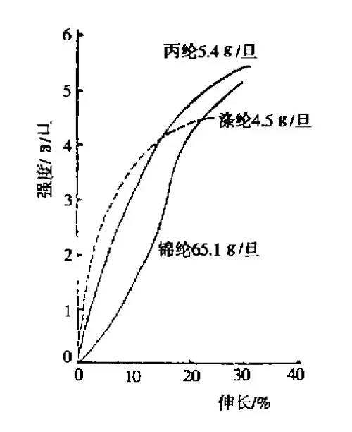 對紡織纖維的斷裂強度要求為5g/旦左右, 下圖為滌、丙、錦長絲應力應變曲線, 丙綸的斷裂強度介于滌、錦之間。